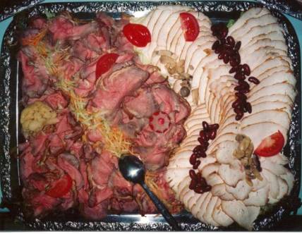 Bratenplatte Schinkenbrett Schweinefilet mit Paprika-Dip Putenbruststreifen „Bombay“ Lachs- und Forellenplatte mit Sahnemeerrettich Matjes auf Apfelringen Kartoffelsalat mit Speck & Zwiebel Reissalat Fruchtsalat „Indisch“ Salatmolle mit Joghurtsahne & Senfessigdressing Käsebrett Brotauswahl Butter „Natur“ & Kressebutter